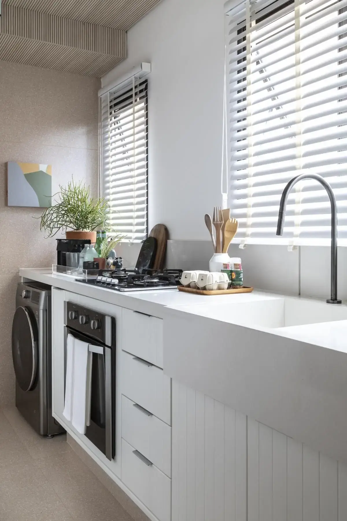 A marcenaria precisava envolver tudo isso, estar amarrada com este conceito e, mais do que estar, precisava apresentar um bom volume de armários para comportar todos os utensílios, incluindo também armazenamento alto para guardar vassoura, rodo, tábua de passar roupa e escada, além de camuflar o aquecedor a gás.