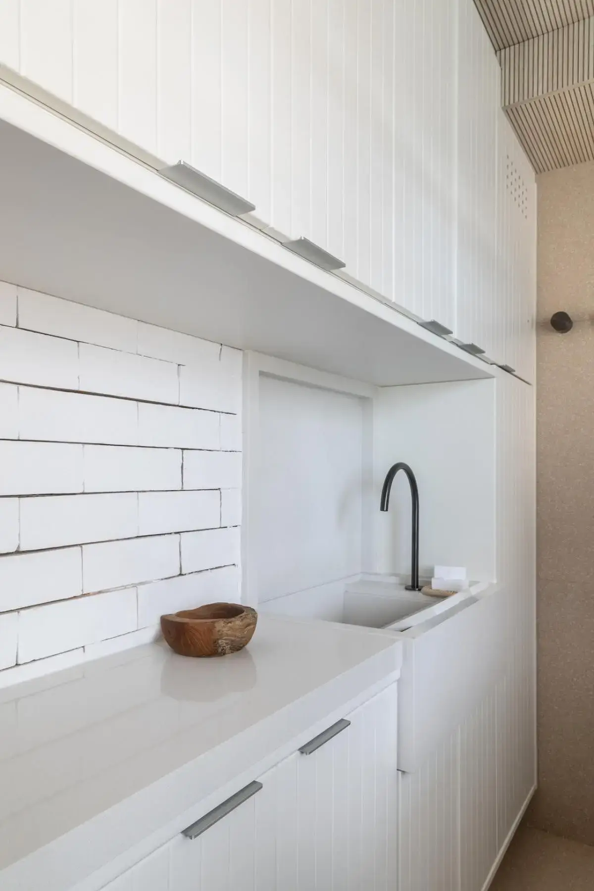 Para complementar o ambiente planejado pela Criare, Renato escolheu revestimentos claros, como o piso em porcelanato rosado com textura de pedra e a parede de tijolos que foram pintados de branco. Além disso, ele investiu em uma iluminação direta com spots e um forro de madeira bem claro frisado, além da bancada branca, tudo para trazer uma sensação de leveza ao espaço.