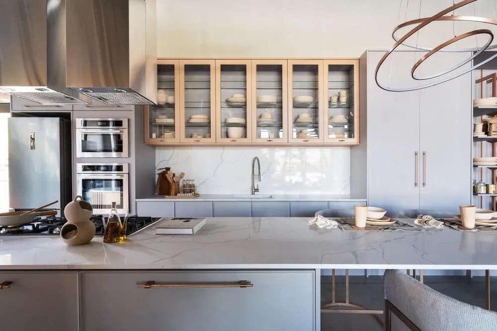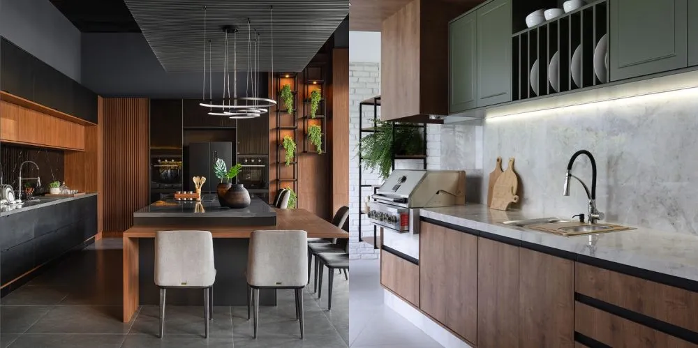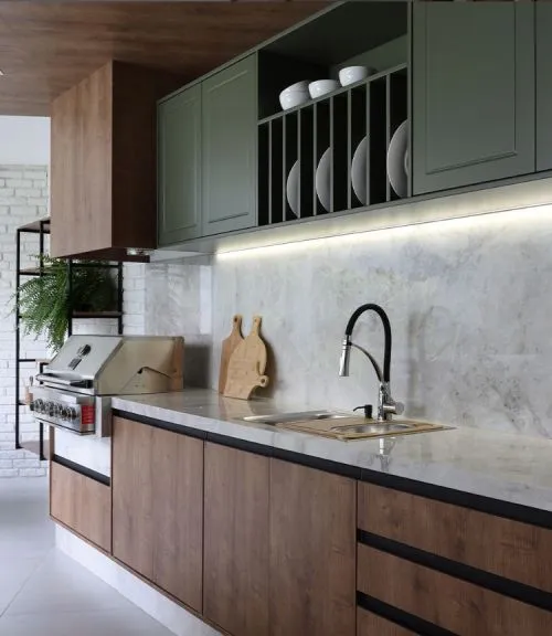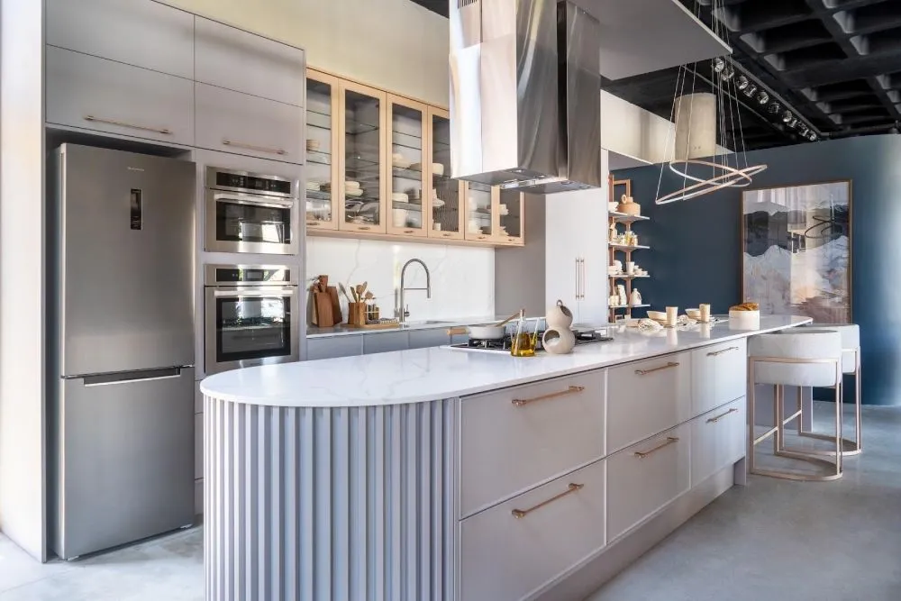 A tendência de integrar eletrodomésticos, como cooktops e fornos, às bancadas e ilhas otimiza o espaço e cria um visual clean. Esta abordagem é ideal para cozinhas compactas, onde cada centímetro conta. Além disso, facilita a criação de áreas de trabalho eficientes e ergonômicas.