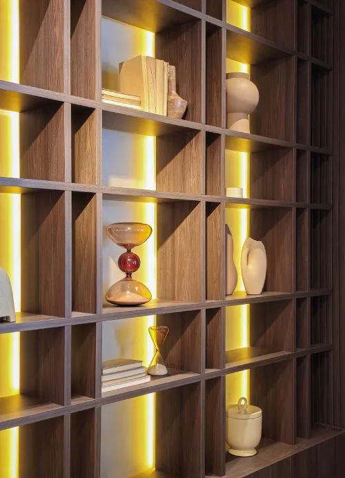 Como um toque artístico em uma exposição, a Criare transforma uma estante em uma instalação luminosa, onde cada nicho é uma vitrine para peças decorativas que capturam a essência da identidade do ambiente. Os pontos de luz cuidadosamente planejados oferecem uma nova dimensão a cada objeto, evocando a sensação de uma galeria de arte privada.