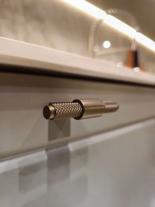 A beleza está nos detalhes, como nos puxadores que chamam a atenção sem interferir na harmonia da sua cozinha planejada. Estes pequenos elementos de design, muitas vezes subestimados, são capazes de adicionar textura e personalidade, transformando gavetas e armários em peças exclusivas que refletem um senso estético apurado, onde cada toque é uma homenagem à arte do design de móveis da ourivesaria no seu ambiente.