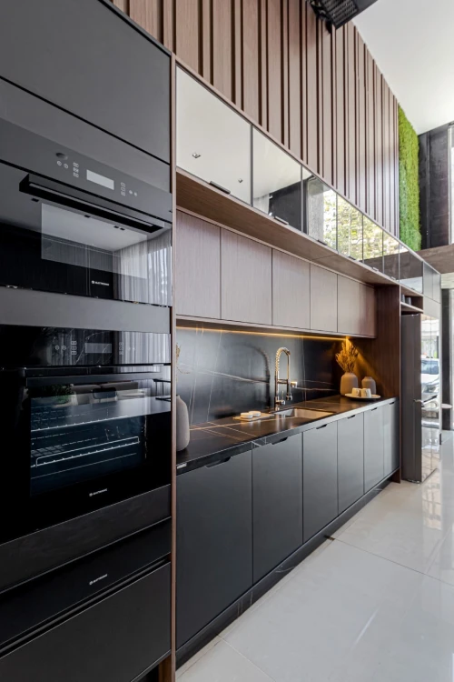 Luzes LED sob os armários superiores iluminam a bancada, e o uso de espelhos reflete a luz, criando a sensação de um espaço maior. Essa abordagem não só maximiza o espaço disponível, mas também garante um ambiente bem iluminado e funcional.