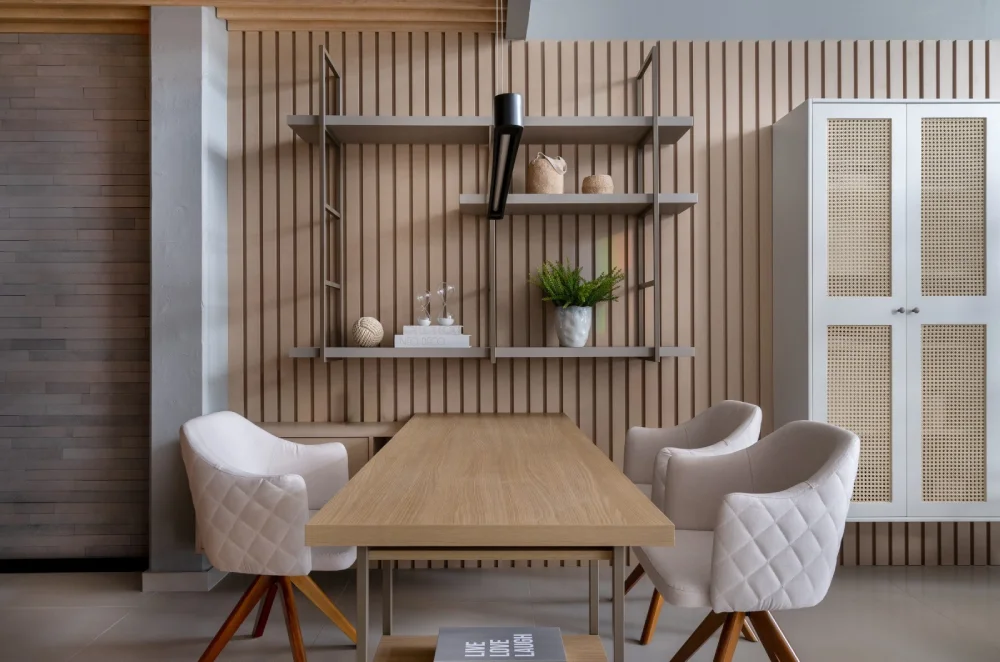 O uso de materiais naturais, como madeira clara, pode trazer uma sensação de frescor e conexão com a natureza.