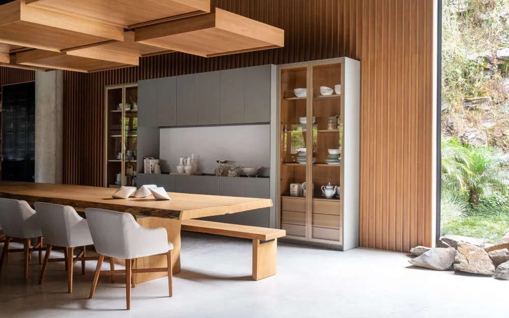 Materiais naturais e texturizados ganham força: madeira com acabamento fosco, pedra bruta, concreto aparente e superfícies em aço escovado criam contrastes elegantes e táteis. O acabamento acetinado ou com toque soft, tanto nas superfícies quanto nos puxadores embutidos, reforça o visual contemporâneo e minimalista.