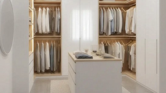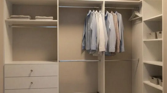 Esse modelo funciona bem tanto em ambientes médios quanto em closet pequeno, sendo comum em suítes e dormitórios onde não há espaço suficiente para um closet em U. A organização costuma ser eficiente, desde que a distribuição interna seja bem planejada.