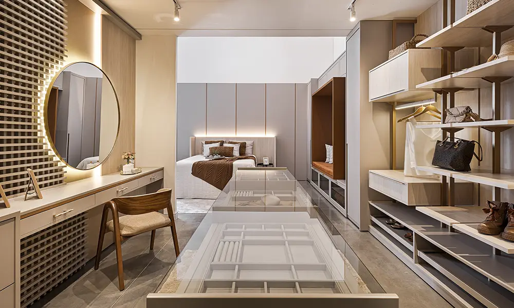 A escolha correta dos materiais facilita a limpeza, reduz a necessidade de manutenção constante e contribui para a preservação das roupas ao longo do tempo. Em closets integrados à suíte, essa atenção é ainda mais importante devido à variação de umidade e temperatura.