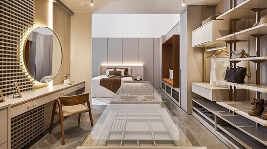 É comum que o closet feminino esteja integrado ou próximo a uma penteadeira, prevendo apoio para maquiagem, cuidados pessoais e uso de ferramentas térmicas, como secador e babyliss.