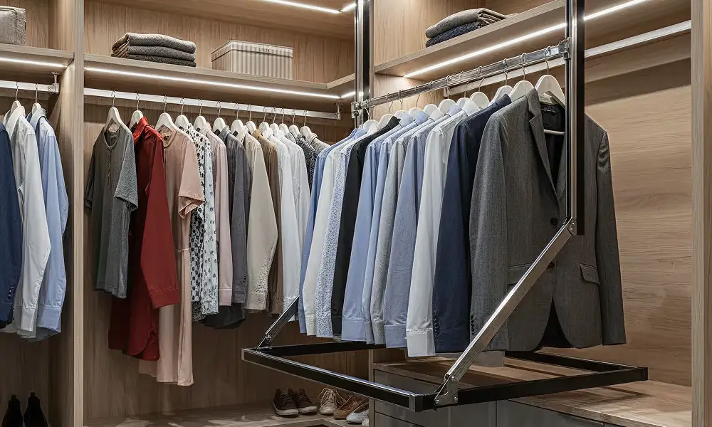 Os cabideiros basculantes são soluções eficientes para aproveitar a verticalidade do closet. Eles permitem o uso de áreas mais altas sem comprometer o conforto, tornando o acesso às peças mais ergonômico.
