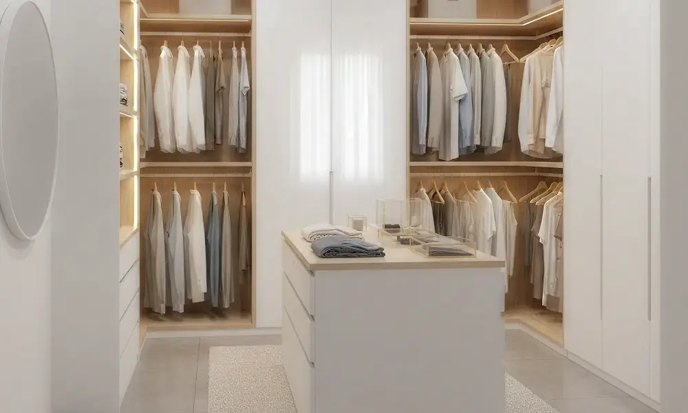 O closet clean se destaca pela neutralidade visual e sensação de ordem. Cores claras, poucos contrastes e superfícies contínuas criam ambiente leve, organizado e fácil de manter.